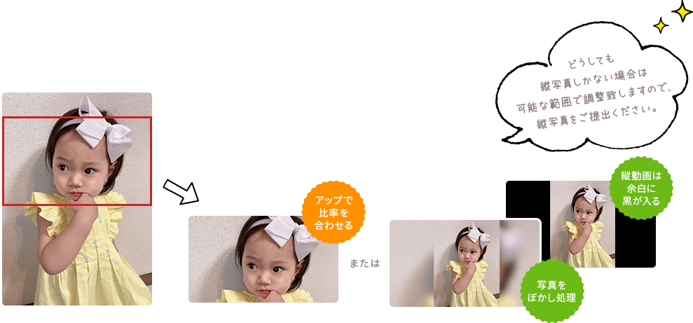写真のアップやブラー処理(余白ぼかし処理)が必要となります。